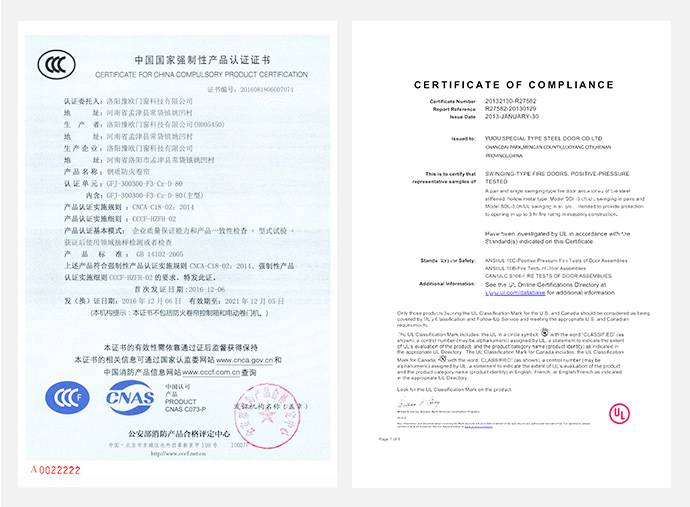 鋼質(zhì)防火門是指用冷軋薄鋼板作門框、骨架、門板,在門扇內(nèi)填充不燃隔熱材料,根據(jù)需要可以在門扇上安裝復(fù)合防火玻璃及門扇上方設(shè)有A類復(fù)合防火玻璃亮窗,并配以防火五金配件所組成的能滿足耐火完整性和隔熱性要求的門。鋼質(zhì)防火門按耐火極限可分為甲 級(jí)、乙級(jí)、丙級(jí)三類防火門,其耐火極限要求分別為72min、54min和36min。鋼質(zhì)防火門應(yīng)采用冷軋薄鋼板制作門框、門扇面板及加固件。門框與門扇鋼板厚度分別為1.2mm~1.5mm和0.8mm~1.2mm。加固件鋼板厚度為1.2mm~1.5mm,如設(shè)有螺孔則不低于3mm。用于鋼質(zhì)防火門的五金配件需要是耐火五金配件,主要五金配件為:防火合頁(yè)(鉸鏈)、防火插銷、防火門鎖、防火順序器和防火閉門器等。
